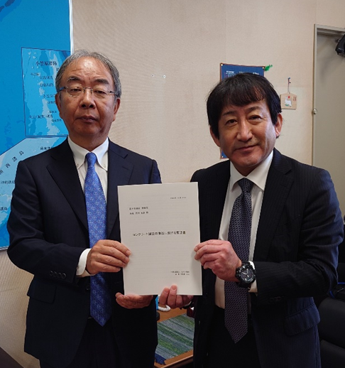 「コンクリート舗装の推進に関する要望書」国土交通省道路局長へ手交 10月31日、小山副会長が丹羽国土交通省道路局長と面会し、「コンクリート舗装の推進に関する要望書」を手交し要請を行った。小山副会長は要望書の記載事項以外にも、コンクリート舗装は、高耐久であり補修工事を減らすことが出来るため、人手不足の改善にもつながると説明し、丹羽局長も要望書の内容に理解を頂き、人手不足改善については良い提案であり、参考としたいとの発言があった。