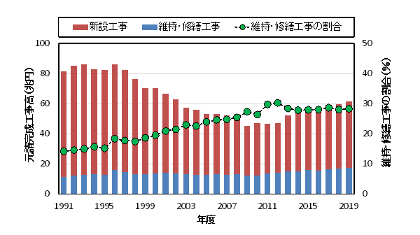 □ 元請完成工事高をみると、新設工事に対する維持・修繕工事の割合が増加しております(図1)。