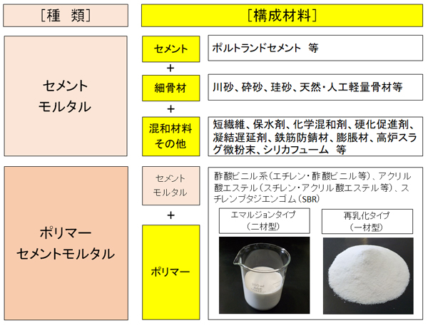 ポリマーセメントモルタルは、粉末化させた再乳化タイプのポリマーを用い、これを他の材料とともに既調合(プレミックス)する「一材型ポリマーセメントモルタル」と、水に分散させ、安定化させたエマルジョンタイプのポリマーを練混ぜ時に加える「二材型ポリマーセメントモルタル」があります。