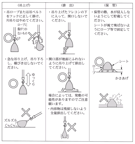 フレキシブルコンテナは重量物用容器であるため、安全管理に十分配慮して作業を行ってください。