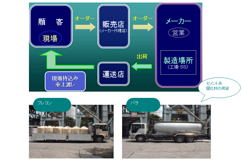 セメント系固化材には、紙袋・フレキシブルコンテナ・バラの荷姿があります。