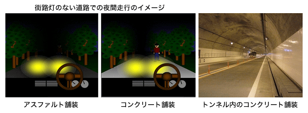 - コンクリート舗装は路面が白色に近く路面反射率が高いので、トンネル内や夜間における路面の視認性が良好。
