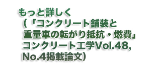日本のセメント協会でも、大型車の走行抵抗と舗装路面の関係に関する調査を実施し、成田空港内での走行試験において、コンクリート舗装における走行抵抗が、アスファルト舗装よりも6〜20%程度小さいという結果が得られています(2006年度)。さらに高速道路、国総研試走路における走行抵抗試験を実施し、結果を解析(2007年度)、さらに燃費についても分析しています。