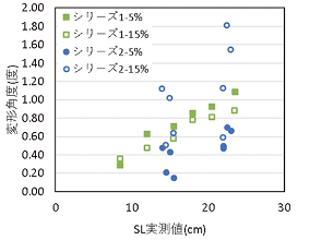 仕上げ面のダレを抑制するには、スランプを小さくすること、単位粗骨材かさ容積(以下、かさ容積)を大きくすることが有効です。図9-1および図9-2は、コンクリートの打込み後に鋼製型枠(15×15×53cm)を傾ける(5%、15%)ことで、コンクリートの配合条件がコンクリートの仕上げ面のダレにどのような影響があるか実験的に検討した結果です。図中の変形角度が大きいということは、仕上げ面の変形が大きい(ダレが大きい)ということを表しています。図9-1より、スランプ(図中、SL)が小さいほど、変形角度も小さくなり、ダレが抑制されることが分かります(図中、シリーズ1)。一方で、スランプまたはスランプフローが同一であっても、図9-2に示すようにかさ容積を大きくすることで、変形角度を小さくすることができます。例えばスランプフロー40cmの場合に、かさ容積を0.02m3/m3大きくすることで、スランプを約2.5cm小さくすること同等の効果が得られています。