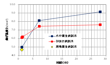 過去にセメント協会では、水中養生供試体と試験施工したコンクリート版から引き抜いたカット供試体と強度の比較を実施しております。結果、材齢1日の段階ではマスによる効果により水中養生供試体よりコンクリート版の方が曲げ強度は大きくなりますが、材齢7日の時点で逆転し、コンクリート版は材齢7日からは強度増進はほぼありませんでした。これは一般的に言われている通り、水中養生の場合は水和反応が継続し組織が緻密化するのに対し、養生を終了したコンクリート版は水和反応が緩慢になり、空隙構造の変化が小さいことが原因と考えられます。ただし、1DAY PAVEの材齢7日の曲げ強度は6〜7N/mm2程度に達することが多く、一般的な舗装構造の設計基準曲げ強度4.5 N/mm2を上回るため、一般的なコンクリート舗装と同等以上の構造性能を有していると考えられます。