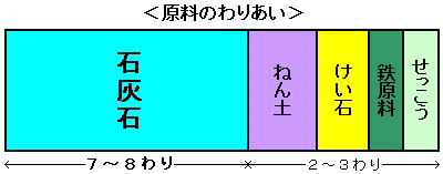 セメントの原料は、「石灰石(せっかいせき)」・「ねん土」・「けい石」・「酸化鉄原料(さんかてつげんりょう)」・「せっこう」などだよ。この中でも、石灰石(せっかいせき)を使う量が一番多くて、70〜80%をしめているんだ。 これらの原料のほとんどは日本国内で手に入るんだよ。とくにたくさん使う石灰石(せっかいせき)の鉱山は、中国地方や九州地方に数多くあって国内自給率(こくないじきゅうりつ)は100%だよ。