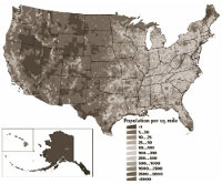 一般に、米国で最も人口密度の高い地域は相変わらず東海岸と五大湖地方であるが、人口の移動は主に南西、西、南の方に向かっている。都市のスプロールに関する最近の報告によると、米国の郡単位人口増加率の上位20位まではアリゾナ、カリフォルニア、ネバダ、テキサス、フロリダ、ワシントンの各州に含まれる5)。