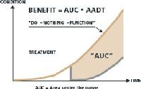 オーストリアのVIPMSシステムの費用便益分析ルーティンでは、ネットワーク内の多くの舗装区間のそれぞれについて、複数の処置方法からひとつを選ぶために便益費用増分分析が用いられている。便益は、ある処置方法について予測される状態曲線と何もしなかった場合の状態曲線の間の面積として数量化され、交通量で重みが付けられる。図10にこの便益の定義を図示する。