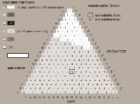 プログラムに使用されている3つの主な決定基準(コスト、環境への影響、その他の要素)に対し、図15に示す重み付けの三角形を使うと、異なる重みの組み合わせを比較し、その組合せがどの程度最終結果に影響するかを見ることができる。三角形の各辺は、「コスト」、「環境への影響」、「その他の要素」の各重み付け要素を0~100%で示している。分析で評価される舗装の選択肢には番号が付けられる(最大6まで。図15の例では2種のみを比較)。三角形の中の各セルは三つの要素の重みの組合せを表し、各セルの数字はその組合せに好適な設計の選択肢である。四角で囲まれたセルは現在の分析で実際に使われた要素の重みの組合せを示している。四角形が望ましい選択肢が変わる境界線に近い場合は、選択した重み要素の組合せが結果に鋭敏に影響することを図式的に説明している。