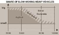 1990年代後半に、FSVは「ガイド・ドキュメントRVS 2.21各種舗装法の経済性評価」を作成し、2001年にはすべての連邦道路の舗装種類の選択に、RVS 2.21の使用が義務付けられた。現在では、舗装の種類はRVS 2.21で概説されたライフサイクルコスト分析を基にして選択されている。一般に、コンクリートは負荷の高い道路(1日当たり大型車両8,000台以上)や低速大型車の多い区間でコンクリートが選ばれる傾向にある。アスファルトかコンクリートかを選択する際に、大型トラックの年平均日交通量と交通流内での低速大型車の比率がどのように影響するかを表す概念図を図7に示す。