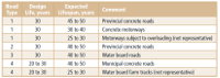 同じ研究で、オランダ国内の異なる機能クラスの4種のコンクリート舗装路の設計寿命と実際に予想される寿命について、表1に示す結論が得られた。これらの実際の寿命は、オランダでの50年以上の実績に基づいたものである。タイプ1は主要道路網および高速道路局や州が管理する高速道路、タイプ2は州が管理する交通量の多い道路と郡道、タイプ3は州、地方自治体、水道委員会が管理する交通量が中程度の道路、連絡道路、バス専用レーン、タイプ4は地方自治体と水道委員会が管理する交通量の少ない道路と農道である。
