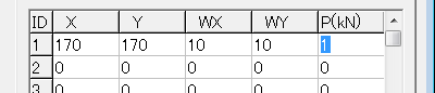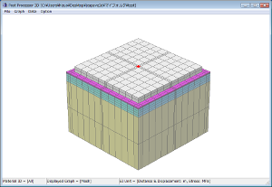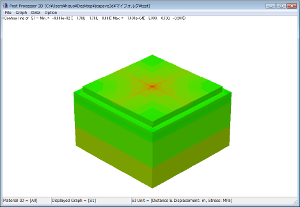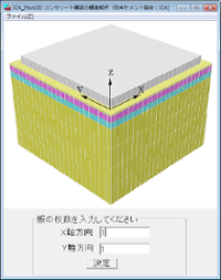 1)版の枚数の決定 ソフトの起動時に表示される図1で「決定」ボタンを押す。図1の画面は「版の枚数」を決定する画面で、ここでは既入力の1枚に設定。表示される次の画面で「表示」ボタンを押すと図4のように解析モデルが表示される。 2)「境界面」の設定 「境界面」の設定で、「付着の程度」を「付着有り」を選択する(図5)。選択すると、材料定数が自動入力される。 3)「荷重」の設定 「荷重」の設定で、版中央の10×10の領域に1kNを設定する(図6)。(X=170、Y=170、WX=10、WY=10、P(kN)=1) 「表示」ボタンを押すと、設定した荷重の位置を確認することができる。 4)ファイルの保存 ファイルを保存する(図7)。ここでは「マイフォルダ」に"test"で保存する。「マイフォルダ」に、test(.txt)とtest(.msh)の二つのファイルが作成される。 test(.msh)ファイルを開くことで、保存した解析条件を再度設定することができる。 test(.txt)ファイルは、要素分割プログラムの入力ファイル。 5)要素分割の実行 要素分割プログラムを実行する(図8)。コマンドプロンプトが表示され、処理が実行される。正常に終了すると、コマンドプロンプトは閉じ、「マイフォルダ」に、test(.pin)ファイルが作成される。 test(.pin)ファイルは、構造解析プログラムの入力ファイル。 6)構造解析の実行 構造解析プログラムを実行する(図9)。コマンドプロンプトが表示され、処理が実行される。正常に終了すると、コマンドプロンプトは閉じ、「マイフォルダ」に、test(.out)ファイルが作成される。 7)結果の表示 解析結果を図示する(図10)。表示項目を選択して、以下のように図示することができる。 |