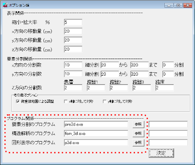 3)「 プログラム関係 」の設定 図3の画面に表示されている「プログラム関係」の設定を行います。「要素分割」「構造解析」および「図形表示」のプログラムについて、それぞれ ボタンを押して、「program」フォルダに保管されている下記プログラムファイル(.exe)を指定してください。