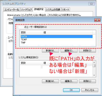 4)「 環境変数 」の設定 マニュアルの7章に記載の「バッチ処理」を行う場合、環境変数の設定を行う必要があります。バッチ処理を行わない場合は、設定の必要はありません。windowsの「スタート」-「コントロールパネル」-「システム」-「システムの詳細設定」から、表示される「環境変数」ボタンを押す。 図4の画面が表示され、ユーザーの環境変数に以下の設定を追加する。